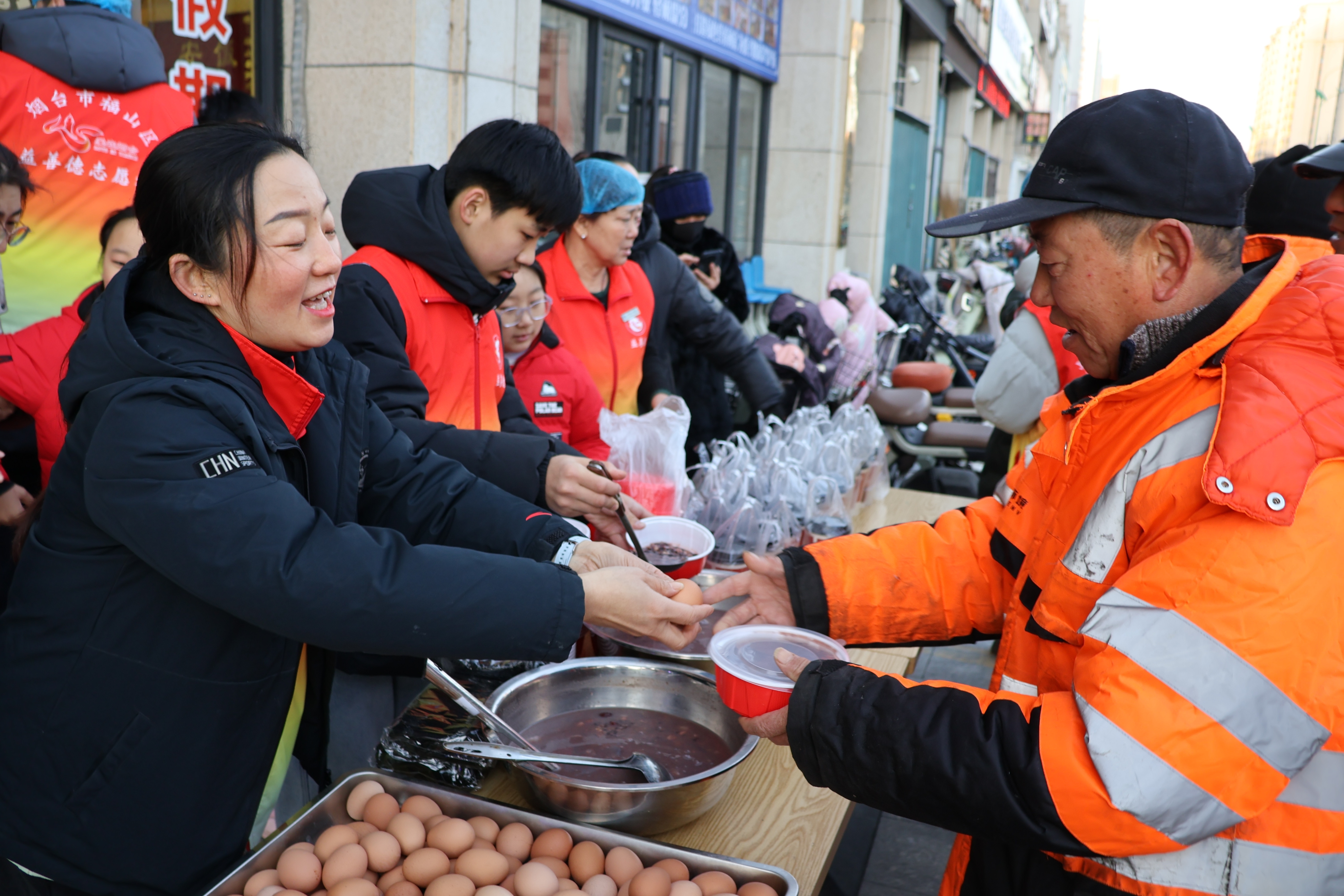 中工网讯 1月25日至26日,山东省烟台市福山区总工会、福山区委社会工作部、福山区委统战部、共青团福山区委联合福山区益善德志愿服务中心、福山区青年志愿者协会、红樱桃爱心协会、汇福街社区、福山区清洋春笋儿童看护服务中心,同步开展“粥暖腊八·爱润福山”主题活动。在“新福驿”暖新驿站、春笋托管、香逸中央美团站点、公交车站、零工市场设立派送点,为1500余名快递员、外卖骑手、网约车司机等新就业群体及户外劳动者免费送上腊八粥、腊八蒜与福山花饽饽。